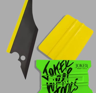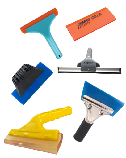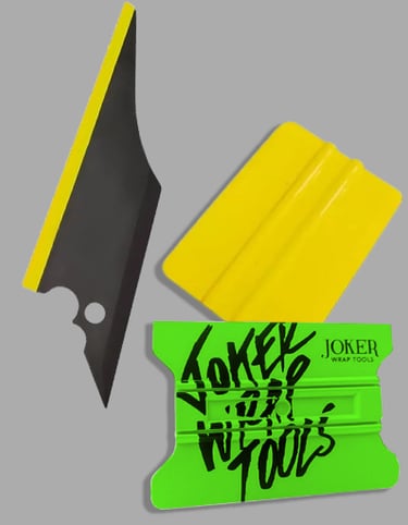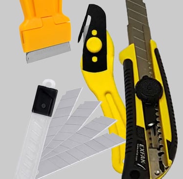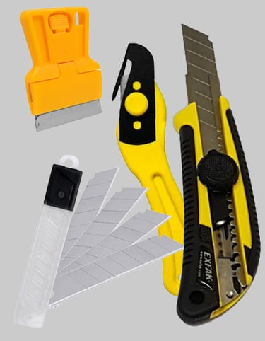 Um catálogo variado de ferramentas para aplicação, corte e refinamento de adesivos.